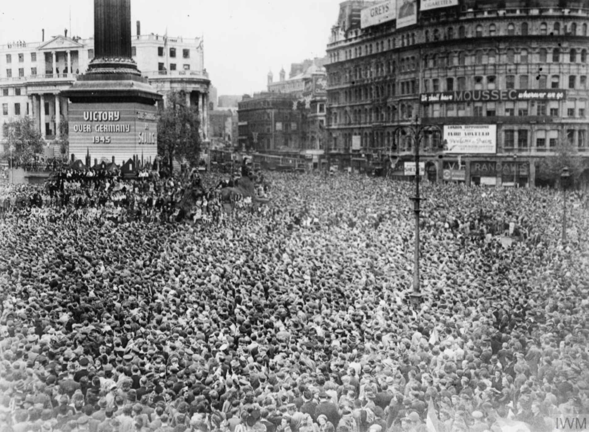 En Angleterre, les stations de radio et les journaux annoncent la victoire des Alliés le 8 mai. Alors que le roi George VI remet des décorations militaires à plus de 270 récipiendaires dans la salle de bal du palais de Buckingham, une foule toujours plus nombreuse se rassemble sur les places londoniennes et devant la résidence de la famille royale. Winston Churchill (1874-1965), Premier ministre et ministre de la Défense, arrive en voiture privée vers midi et déjeune avec le roi. À 15 h, l’homme d’État prononce son fameux discours de la victoire en direct du 10 Downing Street.